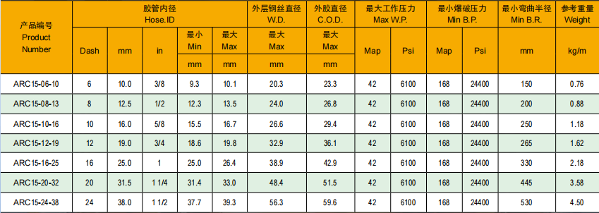 增強(qiáng)層:四層交互纏繞高強(qiáng)度鋼絲(尺寸 3/8 英寸,1/2 英寸,5/8 英寸,3/4 英寸和 1 英寸) 和六層交互纏繞高強(qiáng)度鋼絲(尺寸 1 1/4 英寸,1 1/2 英寸和 2 英寸)